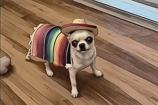 El pequeño perro, con sombrero y sarape, ladra valientemente antes de rendirse al gigante canino