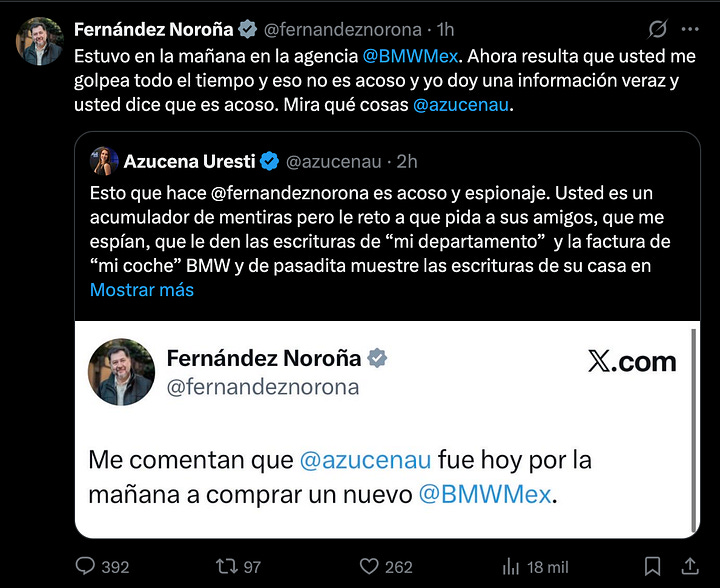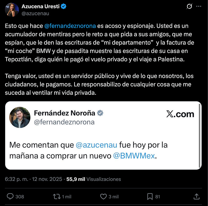 El contexto no es menor. Uresti, conocida por su labor en Milenio Televisión y Radio Fórmula, ha enfrentado amenazas y presiones por su periodismo incisivo, como los mensajes del narcotraficante Nemesio Oseguera en 2021. El tuit de Noroña, publicado ayer a las 03:20 pm , llega en un momento de polarización, con el senador usando su plataforma como servidor público —financiado por los contribuyentes— para lanzar una acusación vaga que roza el acoso. La mención a BMW Mex, la filial mexicana de la automotriz alemana, añade un giro irónico: una marca asociada a lujos que contrasta con el discurso izquierdista de Noroña, quien ha evadido rendir cuentas sobre sus propios gastos, como su polémico viaje privado a Palestina.
