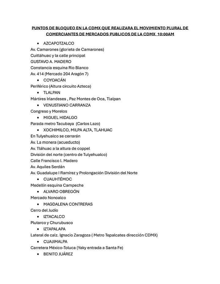 Comerciantes de mercados públicos de la CDMX convocan a un megabloqueo este 30 de julio a las 10:00, en rechazo a la venta de abastos por parte de políticos, que consideran competencia desleal