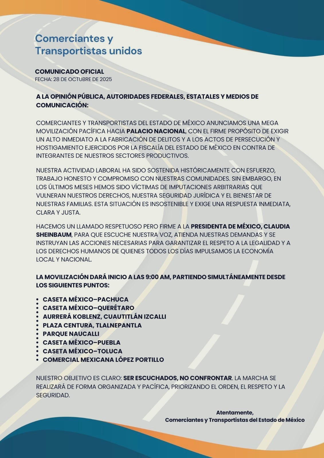 CDMX.- Hoy miércoles 29 de octubre, a partir de las 9:00 de la mañana, transportistas y comerciantes del Estado de México tomarán las principales vialidades que conectan con la capital en una movilización masiva que promete colapsar el tráfico. El anuncio, hecho mediante un comunicado oficial firmado por estos sectores, responde a una creciente frustración por lo que denominan “fabricación de delitos” y “persecución” por parte de la Fiscalía del Estado de México, una queja que resuena tras meses de tensiones con las autoridades.