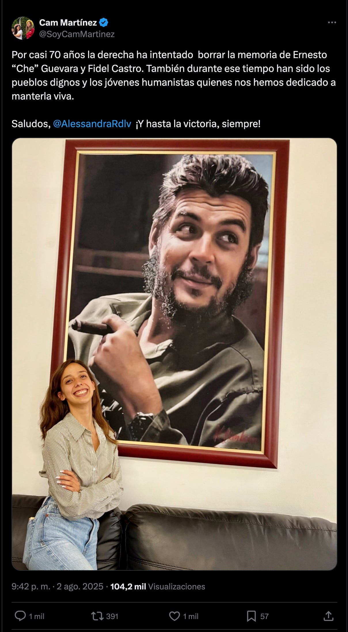 CDMX.- ¡Agárrense, que la cosa se pone tragicómica! Camila Martínez, la flamante Secretaria Nacional de Comunicación, Difusión y Propaganda de Morena –sí, esa joven de 28 años que parece más influencer que revolucionaria–, acaba de subirse al tren del culto al Che Guevara con una foto que da para memes y análisis. Ahí la tienen, posando con una sonrisa digna de TikTok junto a un retrato gigante del barbudo argentino, mientras tuitea que la derecha lleva 70 años intentando borrar su memoria. ¡Ay, Camila, qué heroísmo millennial!