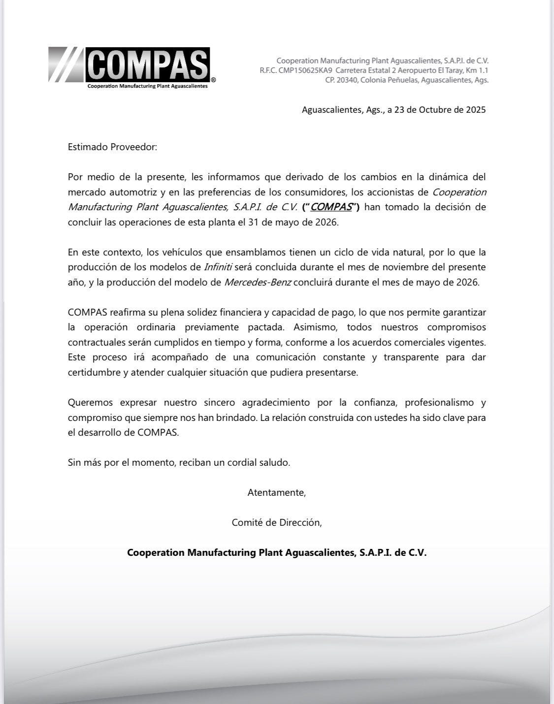 La Cooperation Manufacturing Plant Aguascalientes (COMPAS) informó que cesará operaciones el 31 de mayo de 2026, afectando la producción de vehículos Infiniti y Mercedes-Benz