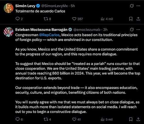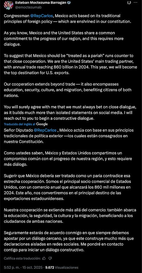 El congresista Carlos Giménez denuncia envíos de 3,000 millones de dólares en combustible subsidiado a Cuba, mientras el embajador Esteban Moctezuma defiende la postura mexicana y propone diálogo