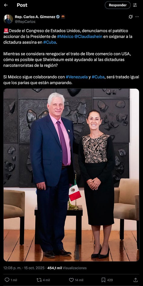 Washington.- Una imagen que muestra al presidente cubano Miguel Díaz-Canel junto a la presidenta mexicana Claudia Sheinbaum, tomada en un encuentro formal, se ha convertido en el epicentro de una tormenta diplomática. Desde el Congreso de EE.UU., el congresista Carlos Giménez acusó a Sheinbaum de “oxigenar” a la dictadura cubana al enviar más de 3,000 millones de dólares en combustible subsidiado este año, una cifra que triplica los envíos de la administración anterior. La denuncia, respaldada por investigaciones de Mexicanos Contra la Corrupción y la Impunidad (MCCI), pone en jaque la política exterior de México y su relación con Washington.