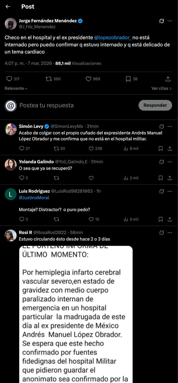 Fernández Menéndez, reconocido por su trayectoria periodística y su colaboración en obras como el libro “Ni venganza ni perdón” con Julio Scherer García, difundió inicialmente en su cuenta de X (@J_Fdz_Menendez) que López Obrador estaba internado en el Hospital General Militar por una afección cardiaca. La publicación generó controversia inmediata y especulaciones en redes sociales y medios, incluyendo menciones a posibles complicaciones graves como un aneurisma.