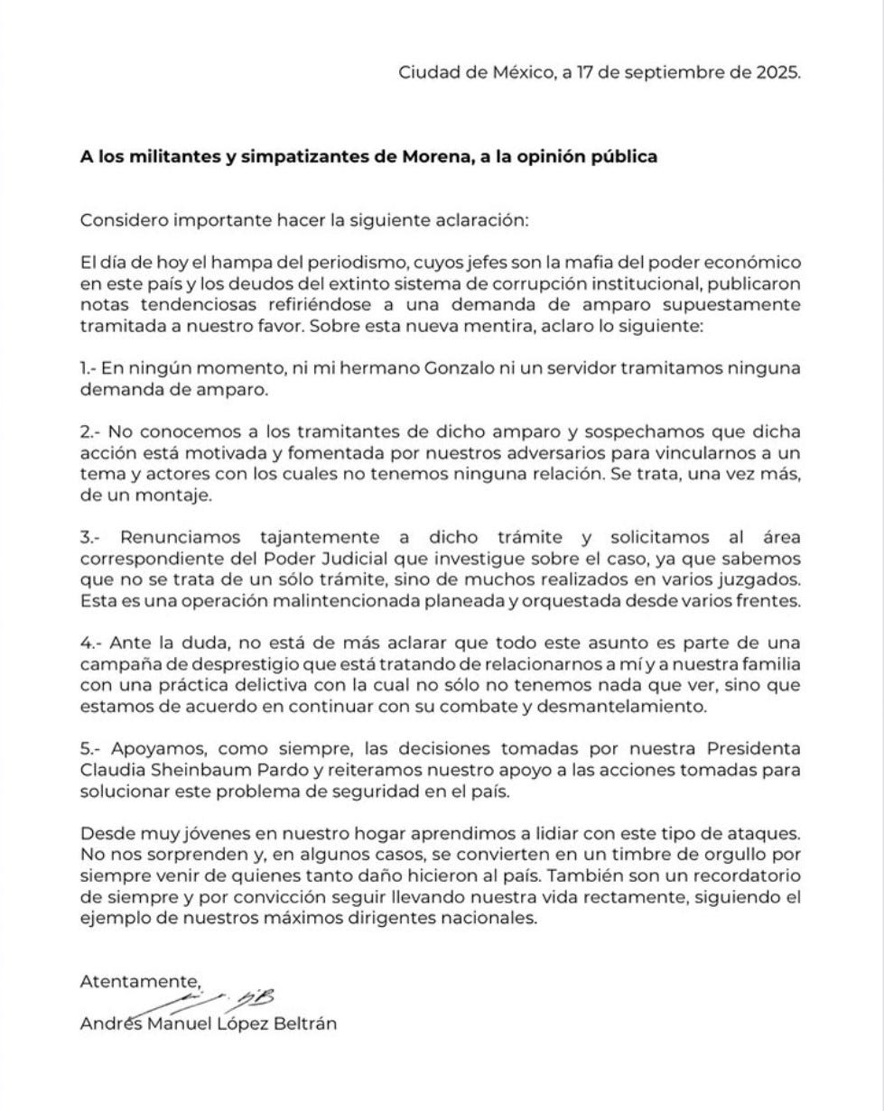 CDMX.- Andrés Manuel López Beltrán, hijo del expresidente Andrés Manuel López Obrador, salió al paso este miércoles con un comunicado que niega tajantemente haber tramitado un amparo contra una posible orden de aprehensión, junto a su hermano Gonzalo y otras 14 personas. El texto, dirigido a militantes de Morena y a la opinión pública, tilda la acusación de ser un montaje orquestado por la “mafia del poder económico” y sus aliados en los medios, mientras exige una investigación al Poder Judicial.