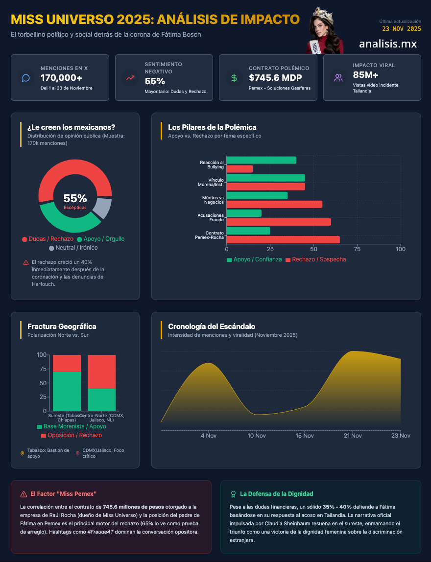 CDMX.— El 21 de noviembre de 2025, Fátima Bosch Fernández, la tabasqueña de 25 años, se coronó como Miss Universo 2025 en Bangkok, Tailandia, convirtiéndose en la cuarta mexicana en lograrlo. Sin embargo, lo que podría haber sido un triunfo unánime se ha transformado en un torbellino de dudas y divisiones. Acusaciones de fraude, presiones a jurados y vínculos familiares con el gobierno de Morena han polarizado a la opinión pública mexicana. ¿Le creen los mexicanos a Fátima? ¿Ven su corona como un logro por méritos propios o como un favor de la élite política? Basado en un análisis de más de 170.000 menciones en X (Twitter) del 1 al 23 de noviembre de 2025, cobertura en 55 medios nacionales e internacionales, y reacciones virales, la respuesta es clara: no, no le creen de manera unánime. La balanza se inclina hacia el escepticismo (55% de menciones con dudas o rechazo), impulsado por el escándalo de los “negocios” con Pemex y Morena, aunque un 35% la defiende por su dignidad y orgullo nacional, y un 10% permanece neutral.