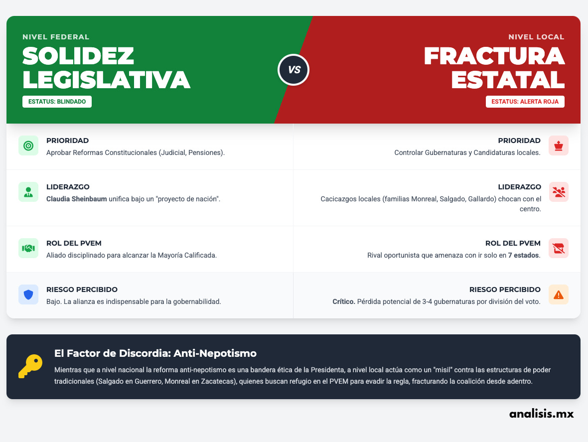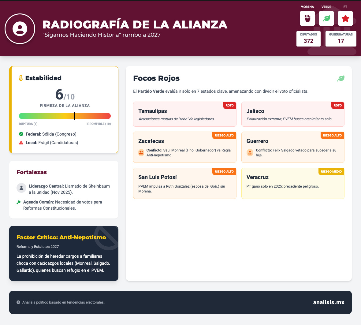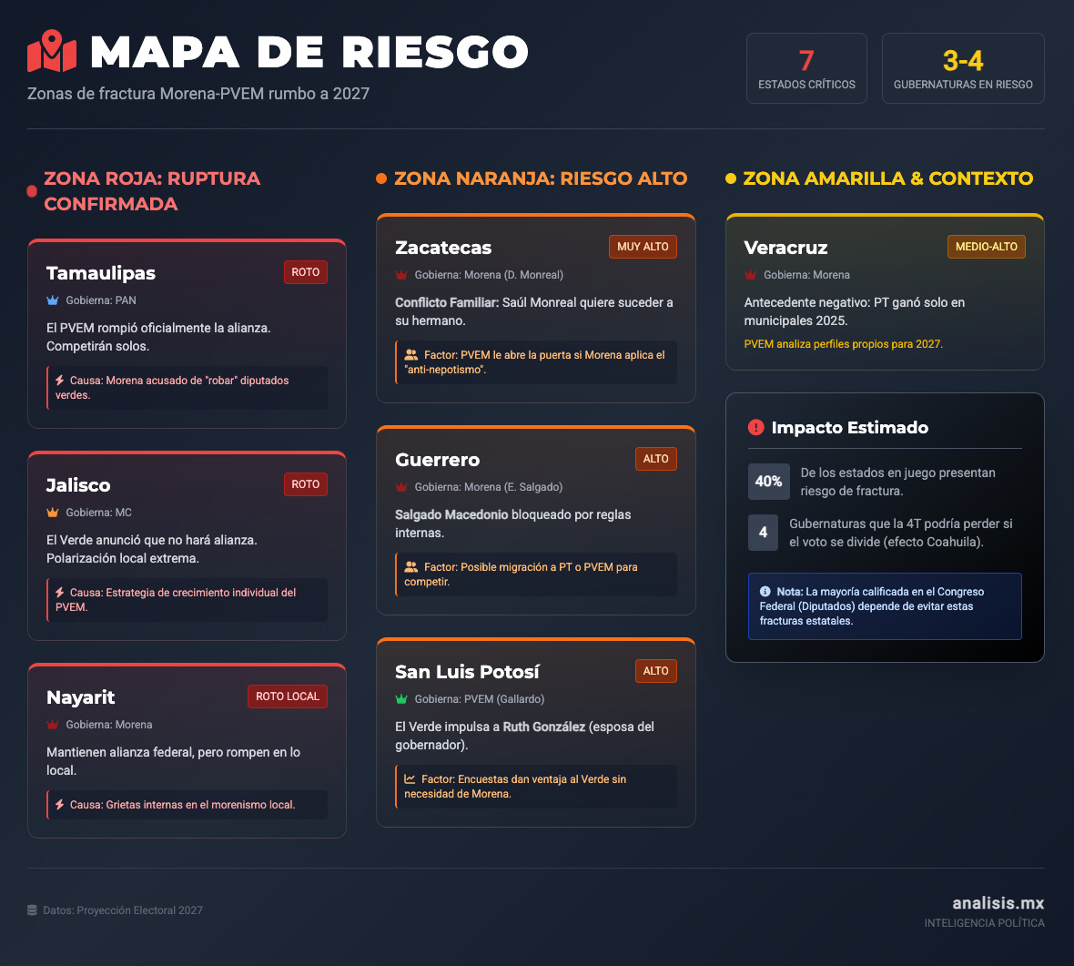 Jalisco (Gobierna MC): El PVEM ya anunció que no hará alianza con Morena y competirá solo, polarizando posiciones locales. Riesgo de fractura con Verde: Confirmado, con maquinaria verde en marcha para candidaturas independientes.