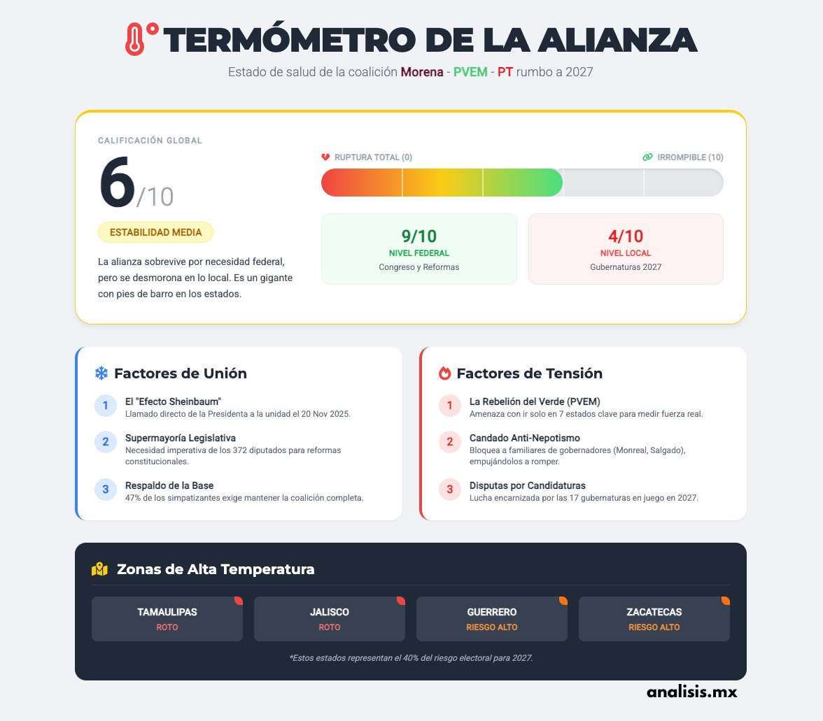 CDMX.— La alianza electoral entre Morena y el Partido Verde Ecologista de México (PVEM), parte de la coalición “Sigamos Haciendo Historia” junto al PT, se encuentra en un momento de aparente consolidación a nivel nacional, pero con fracturas locales significativas que podrían debilitarla en las elecciones intermedias de 2027. Estas elecciones serán cruciales: renovarán la Cámara de Diputados (para mantener la mayoría calificada), 17 gubernaturas, 31 congresos locales y cientos de ayuntamientos. El llamado de la presidenta Claudia Sheinbaum del 20 de noviembre de 2025 a refrendar la coalición fue interpretado como un esfuerzo por unir filas, especialmente para avanzar en reformas constitucionales pendientes. Sin embargo, las tensiones estatales —impulsadas por disputas por candidaturas y el “candado” anti-nepotismo— sugieren que la alianza es firme en el Congreso, pero frágil en el terreno local, particularmente con el PVEM. A continuación, se desglosa el panorama basado en información reciente, destacando que al menos en 7 estados clave se observan fracturas o riesgos inminentes de ruptura con el Verde, lo que podría fragmentar el voto oficialista y costar hasta 3-4 gubernaturas a la 4T.