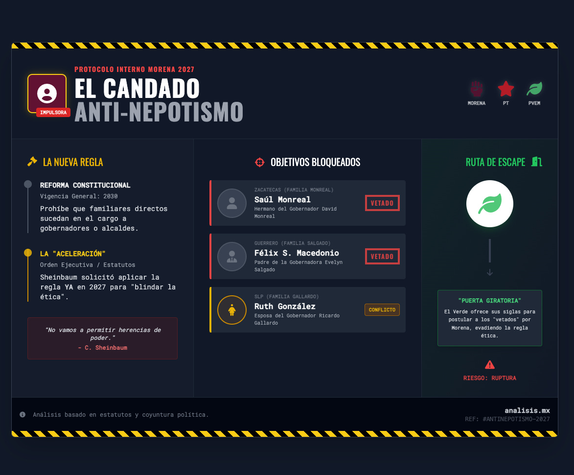 La reforma constitucional contra el nepotismo (aprobada en febrero 2025, vigente desde 2030) fue “adelantada” por Morena a 2027 vía estatutos internos, a petición de Sheinbaum para evitar “herencias de poder”. Esto choca directamente con figuras como Salgado y Monreal, quienes defienden su “derecho constitucional” y encuestas favorables, pero han sido “enfriados” por la dirigencia. PT y PVEM resistieron inicialmente (querían 2030 para proteger aliados), pero ahora PT se alinea públicamente con Sheinbaum. Si Salgado o Monreal migran (e.g., a PVEM), podría fracturar más la coalición, especialmente en estados donde el Verde ya evalúa rupturas.