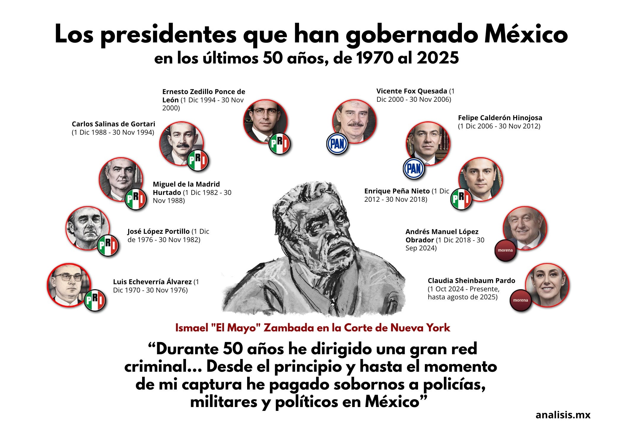 CDMX.— Este 25 de agosto de 2025, Ismael "El Mayo" Zambada, cofundador y líder histórico del Cártel de Sinaloa, se declaró culpable de dos cargos principales relacionados con narcotráfico y crimen organizado ante un tribunal federal en Brooklyn, Nueva York. Durante la audiencia, Zambada hizo una declaración contundente: “Durante 50 años he dirigido una gran red criminal... Desde el principio y hasta el momento de mi captura he pagado sobornos a policías, militares y políticos en México”. Esta confesión, pronunciada ante el juez Brian Cogan, no solo reafirma la longevidad de su carrera criminal, sino que expone una red de corrupción sistémica que, según él, permeó las estructuras de poder en México durante cinco décadas. Este ensayo analiza críticamente estas declaraciones, contextualizándolas con los presidentes de México en ese periodo, la frase atribuida a Andrés Manuel López Obrador (AMLO) de que “el presidente siempre está enterado de todo”, y los datos verificados que sustentan el impacto de estas afirmaciones en el panorama político y social mexicano.