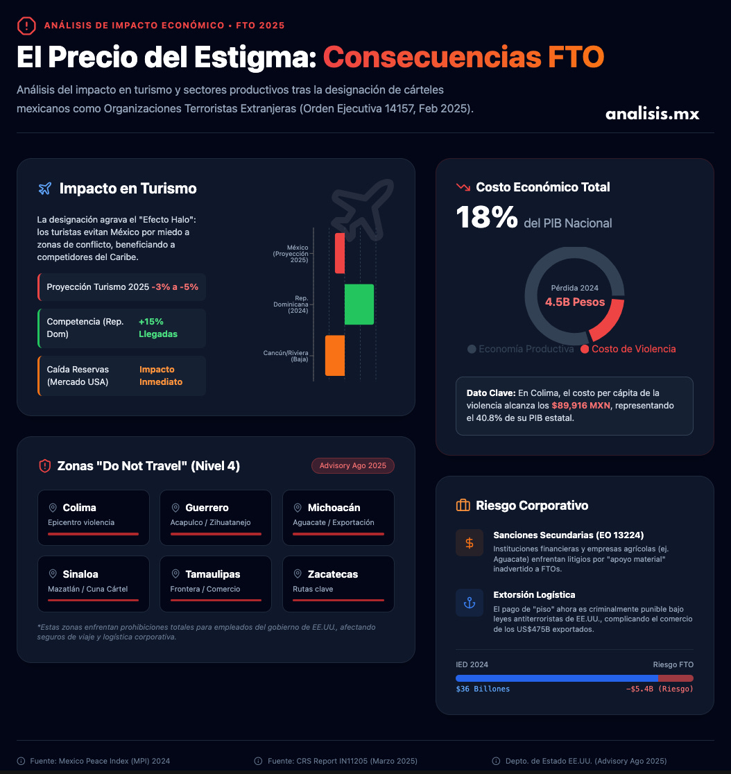 El turismo representa alrededor del 8-9% del PIB de México (según estimaciones del WTTC para 2024), con más de 40 millones de llegadas internacionales en 2023, pero la designación FTO agrava la percepción de riesgo, potenciando el estigma de violencia que ya cuesta miles de millones.
