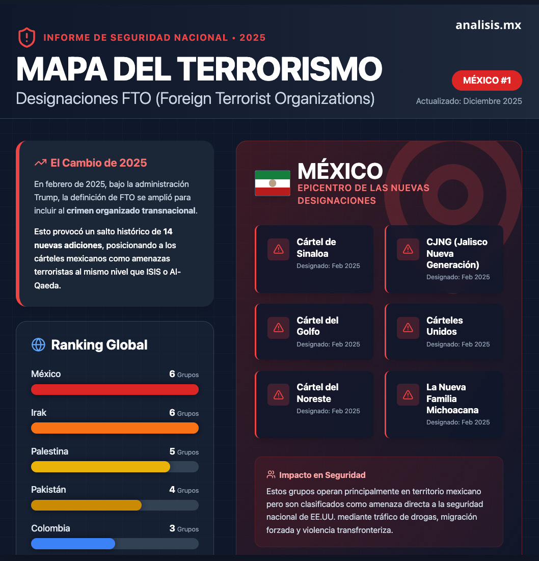 Impacto: Estos grupos operan principalmente en México pero amenazan la seguridad de EE.UU. mediante tráfico de drogas, migración y violencia. La lista total de FTO ha crecido drásticamente en 2025 (14 adiciones nuevas), con México recibiendo el mayor número.