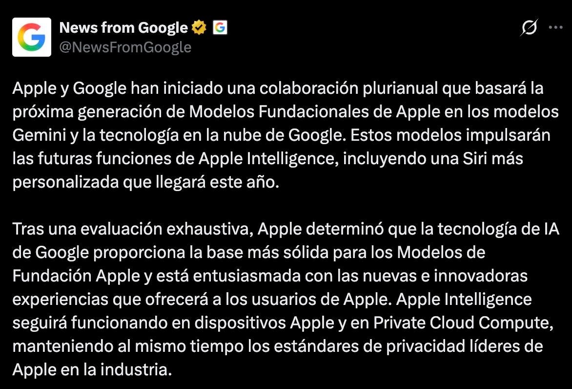 EU.- Apple y Google anunciaron ayer una colaboración plurianual que integra los modelos Gemini de Google y su tecnología en la nube para potenciar la próxima generación de modelos fundacionales de Apple. Esto impulsará funciones avanzadas de Apple Intelligence, como una Siri más personalizada que llegará este año, según el comunicado conjunto publicado en el blog de Google. Tras una evaluación exhaustiva, Apple optó por esta base tecnológica por su solidez, evitando el alto costo de desarrollar modelos propios desde cero, en un contexto donde competidores como OpenAI y Meta han invertido miles de millones en infraestructuras deficitarias.