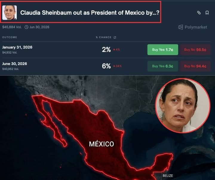CDMX.- La plataforma de predicciones Polymarket, famosa por sus apuestas en eventos políticos y que acertó en las elecciones de EE.UU., ha abierto mercados sobre la posible salida anticipada de la presidenta mexicana Claudia Sheinbaum. Según reportes, los usuarios pueden apostar si dejará el cargo antes del 31 de enero de 2026 (con una probabilidad actual del 1-2%) o antes del 30 de junio (entre 3% y 8%, fluctuando). Esta noticia, surge en un contexto de tensiones crecientes, donde encuestas internacionales citadas por analistas como Alan Adame sugieren que su aprobación ronda el 45%, afectada por controversias como la reforma electoral y presuntos lazos de Morena con el narco.