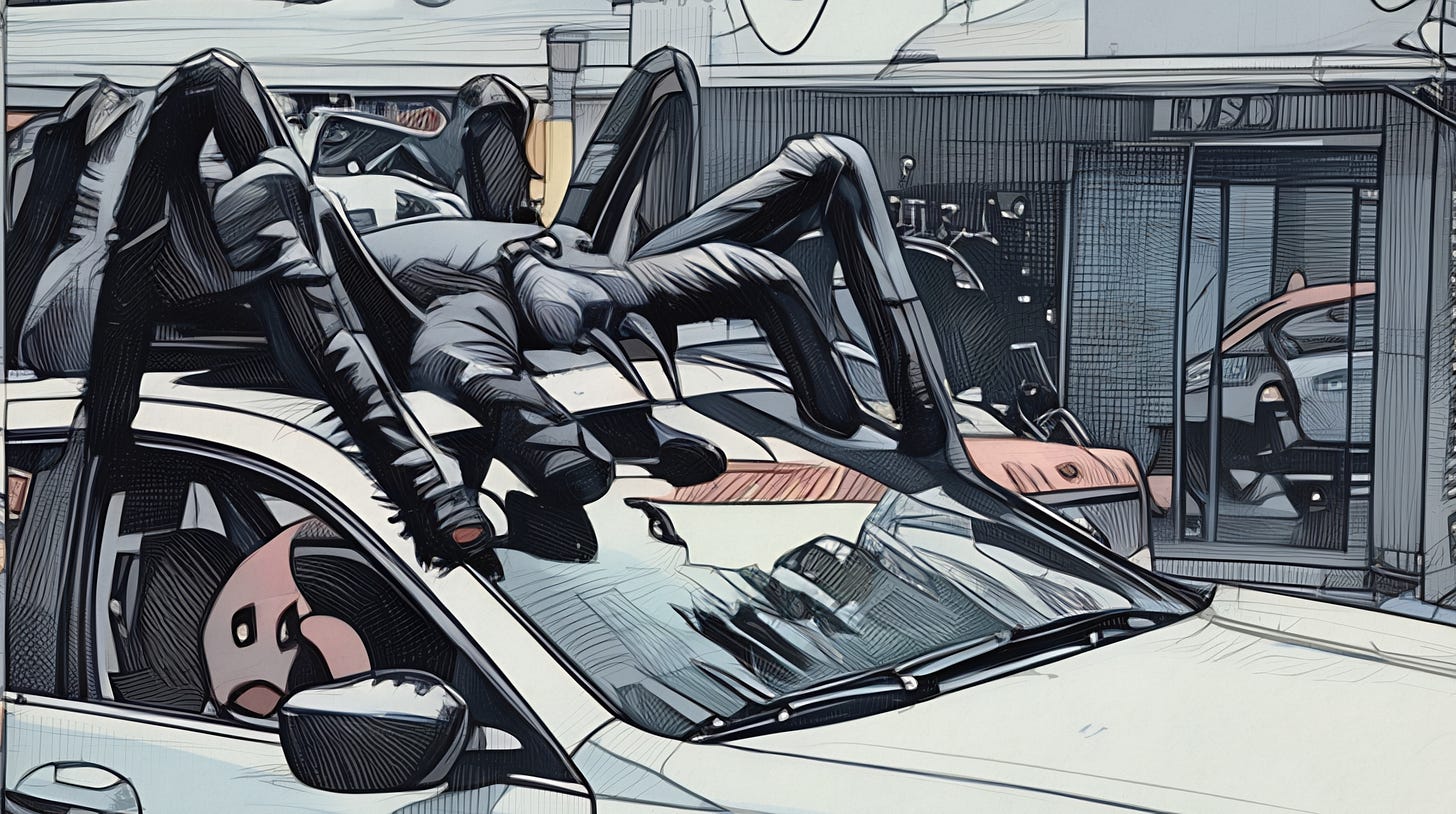 Un automóvil blanco circula por la capital con una araña de dos metros sobre su techo, generando reacciones diversas entre transeúntes y conductores