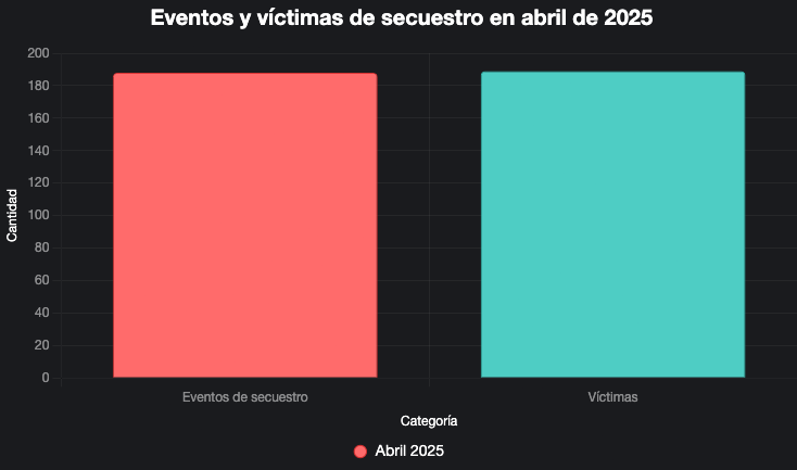 El reporte detalla que en abril de 2025 se registraron 188 eventos de secuestro con 189 víctimas, lo que representa una disminución del 17.8% en el número de eventos en comparación con marzo de 2025, pero un incremento en el número de víctimas. Este aumento en víctimas refleja una mayor intensidad en los casos registrados, lo que plantea preocupaciones sobre la naturaleza de los secuestros.