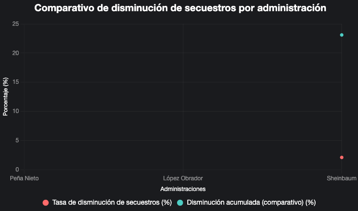 El informe también incluye un comparativo entre octubre de 2024 y abril de 2025, mostrando una disminución del 2.1% en los secuestros durante este periodo en la administración de Claudia Sheinbaum. Sin embargo, esta reducción es menos pronunciada que la observada en los gobiernos de Enrique Peña Nieto y Andrés Manuel López Obrador. Comparado con los últimos dos expresidentes, el reporte señala una disminución acumulada del 23.1% en los secuestros, lo que sugiere que, aunque hay un ligero avance, la problemática persiste y el ritmo de reducción es más lento en el actual sexenio.