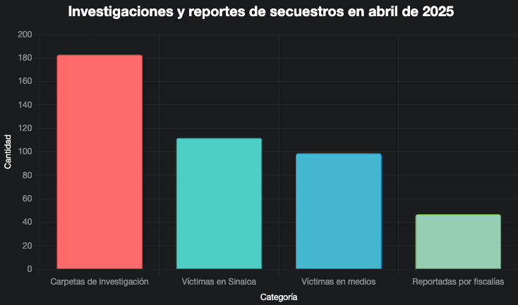 El informe indica que en abril de 2025 se abrieron 183 carpetas de investigación por secuestro, un aumento del 5.1% respecto al mes anterior. Además, se reportaron 112 víctimas en Sinaloa (clasificadas como privaciones ilegales de la libertad), 99 localizadas a través de medios de comunicación (excluyendo Sinaloa) y 47 reportadas por fiscalías estatales y federales. Estos datos reflejan un esfuerzo por parte de las autoridades, pero también una disparidad entre los casos reportados oficialmente y los detectados por otras fuentes.