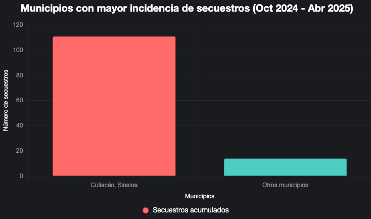 Culiacán, Sinaloa, se posiciona como el municipio con mayor incidencia de secuestros, acumulando 111 casos entre octubre de 2024 y abril de 2025. Otros municipios no especificados en el informe también registraron 14 secuestros cada uno, lo que indica una distribución preocupante de la delincuencia en varias regiones del país.