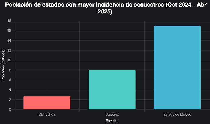 El informe de Alto al Secuestro destaca que, durante abril de 2025, varios estados registraron un aumento en los casos de secuestro. Aunque el documento no especifica el número exacto de estados con incrementos, se señala que Chihuahua, Veracruz y el Estado de México lideran el ranking nacional de incidencia acumulada entre octubre de 2024 y abril de 2025. Estos tres estados, con poblaciones de 2,741,669, 8,062,579 y 16,992,418 habitantes respectivamente, concentran una proporción significativa de los casos a nivel nacional.