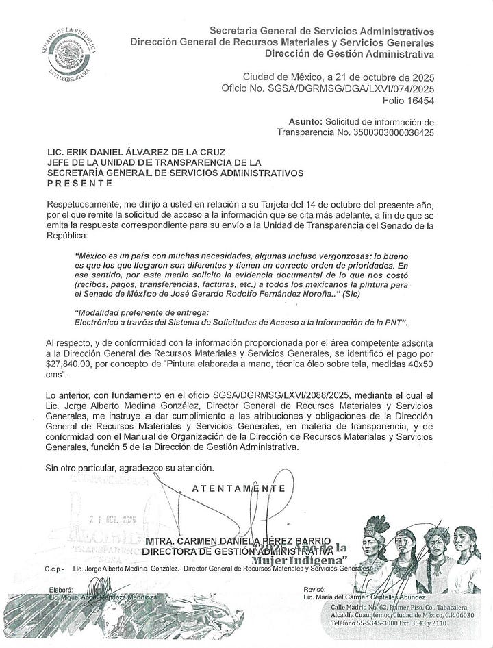 La Mesa Directiva del Senado autorizó 27,840 pesos para un óleo del senador Gerardo Fernández Noroña, pintado por Aurora Argüello Gutiérrez. El retrato ya cuelga en la Galería de Presidentes