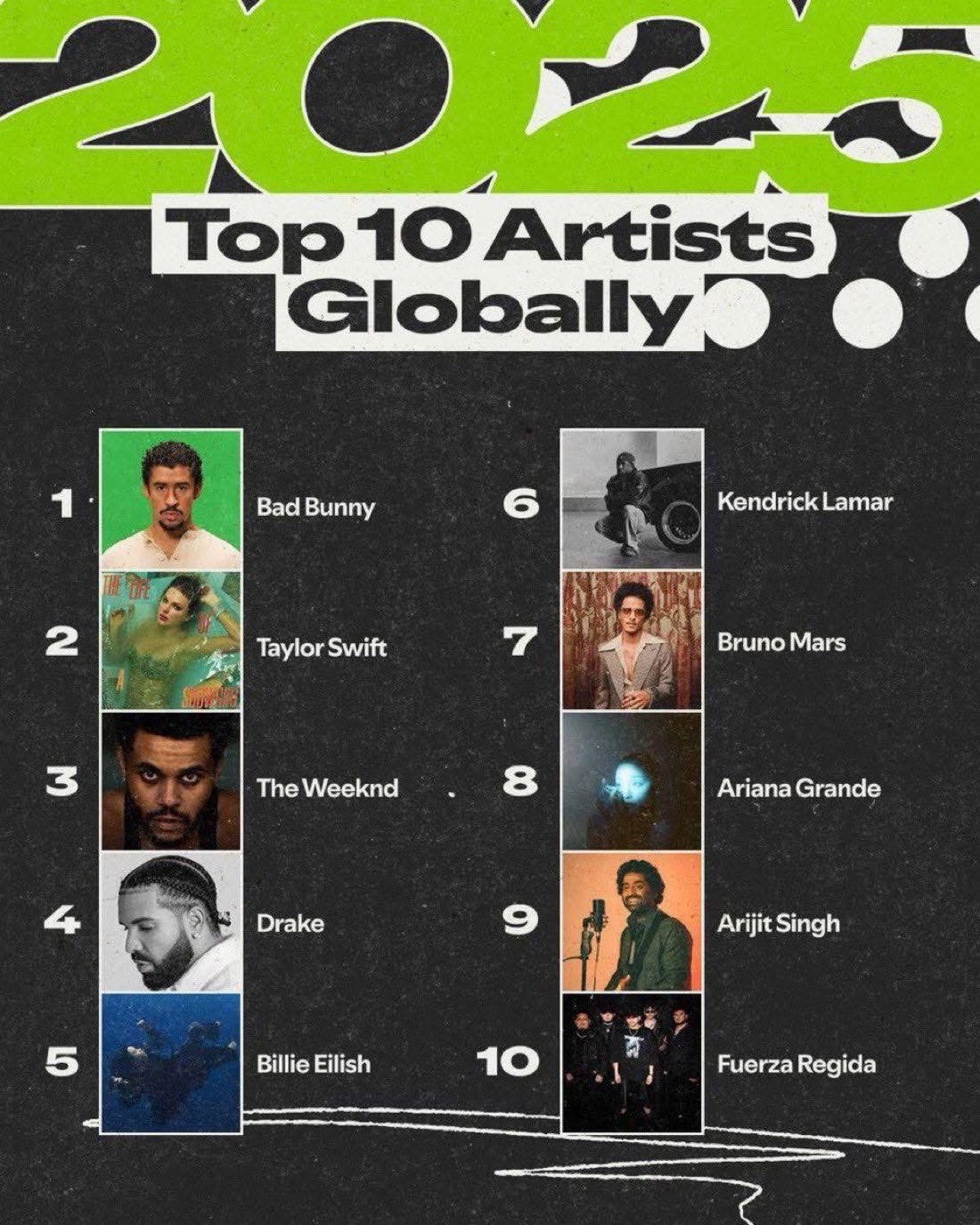 EU.- En un año donde el reggaetón y el pop global se fusionan como nunca, Bad Bunny se corona como el artista más escuchado del mundo en Spotify Wrapped 2025, con más de 19.800 millones de streams que lo colocan por encima de gigantes como Taylor Swift (segunda) y The Weeknd (tercero). La lista completa de los 10 más reproducidos globalmente incluye a Drake en cuarto, Billie Eilish en quinto, Kendrick Lamar en sexto, Bruno Mars en séptimo, Ariana Grande en octavo, el indio Arijit Singh en noveno y la banda mexicana Fuerza Regida cerrando en décimo. Este triunfo del puertorriqueño no solo refleja su dominio en Latinoamérica y EE.UU., sino también su expansión en mercados asiáticos y europeos, impulsado por éxitos como “DtMF” de su álbum Debí Tirar Más Fotos, que también se lleva el galardón al disco más streamado del año.