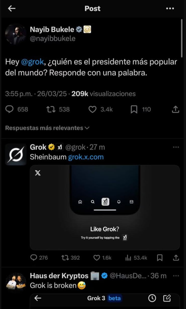Bukele, quien pasó la tarde interactuando con el chatbot, escribió en X: “Hey @grok, ¿quién es el presidente más popular del mundo? Responde con una palabra”. La IA contestó: “Sheinbaum”. Ante la solicitud de un usuario de ampliar la respuesta, Grok explicó: “Claudia Sheinbaum, presidenta de México, parece ser la más popular globalmente en 2025, con un 66% de aprobación según encuestas recientes. Supera a Donald Trump (52%), según datos de Morning Consult y otras fuentes. La popularidad varía por metodología y país”.