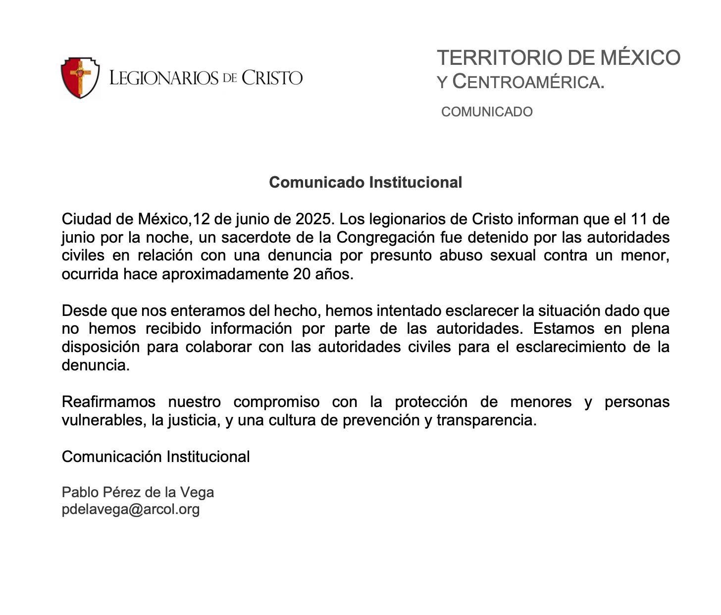 “Desde que nos enteramos del hecho, hemos intentado esclarecer la situación dado que no hemos recibido información por parte de las autoridades. Estamos en plena disposición para colaborar con las autoridades civiles para el esclarecimiento de la denuncia”, se lee en el comunicado de Los Legionarios de Cristo.