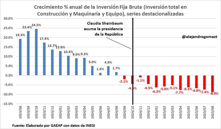 El gráfico, que desglosa el crecimiento anual de la inversión total en series desestacionalizadas, muestra un antes y un después. Entre 2022 y 2023, bajo el gobierno de Andrés Manuel López Obrador, las cifras, aunque volátiles, mantenían un pulso positivo, con picos como el 23.4% en 2022-08 y un promedio que rondaba el 10% en varios meses. Sin embargo, desde octubre de 2024, el panorama se tiñe de rojo: caídas consecutivas de -1.1%, -4%, -6.3%, y hasta -8.9% en octubre de 2025. Este derrumbe no es un accidente aislado, sino el reflejo de un entorno que ahuyenta a los inversionistas.