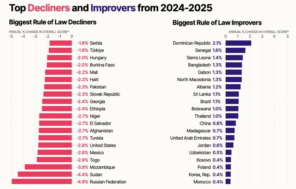 CDMX.- El reciente informe del World Justice Project (WJP) para 2024-2025 pone a México en el ojo del huracán, con una caída del 2.8% en su índice de estado de derecho, situándolo entre los mayores declinadores globales junto a países como Serbia (-1.8%) y Estados Unidos (-2.8%). La gráfica, compartida por Claudio X. González, desata polémica: el empresario señala la reforma judicial impulsada por el gobierno de López Obrador como culpable, advirtiendo que concentra poder y debilita garantías. Sin embargo, la narrativa no es tan simple.