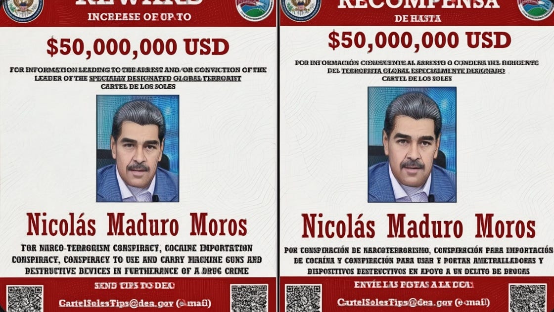 El Departamento de Estado y Justicia de EE.UU. incrementó a 50 millones de dólares la recompensa por información que lleve al arresto o condena del presidente venezolano, acusado de narcoterrorismo