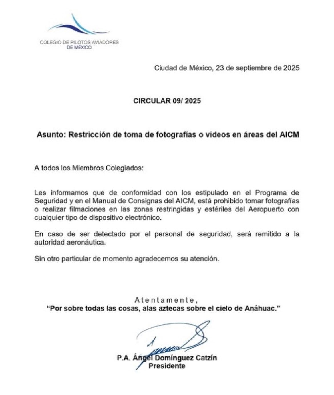 CDMX.- Una circular emitida el pasado 23 de septiembre por el Colegio de Pilotos Aviadores de México (CPAM), firmada por su presidente P.A. Ángel Domínguez Catzín, ha desatado polémica al prohibir la toma de fotografías y videos en las áreas restringidas y estériles del Aeropuerto Internacional de la Ciudad de México (AICM). El documento, que invoca el Programa de Seguridad y el Manual de Consignas del AICM, advierte que cualquier persona sorprendida incumpliendo será remitida a las autoridades aeronáuticas. Pero, ¿es esto una medida legítima de seguridad o un paso hacia la censura?