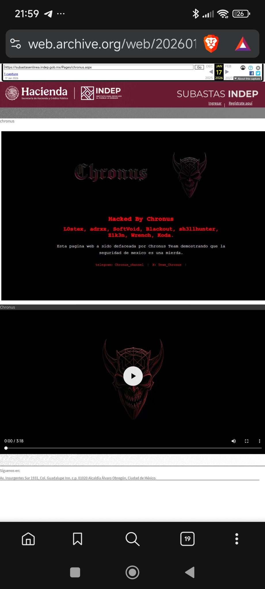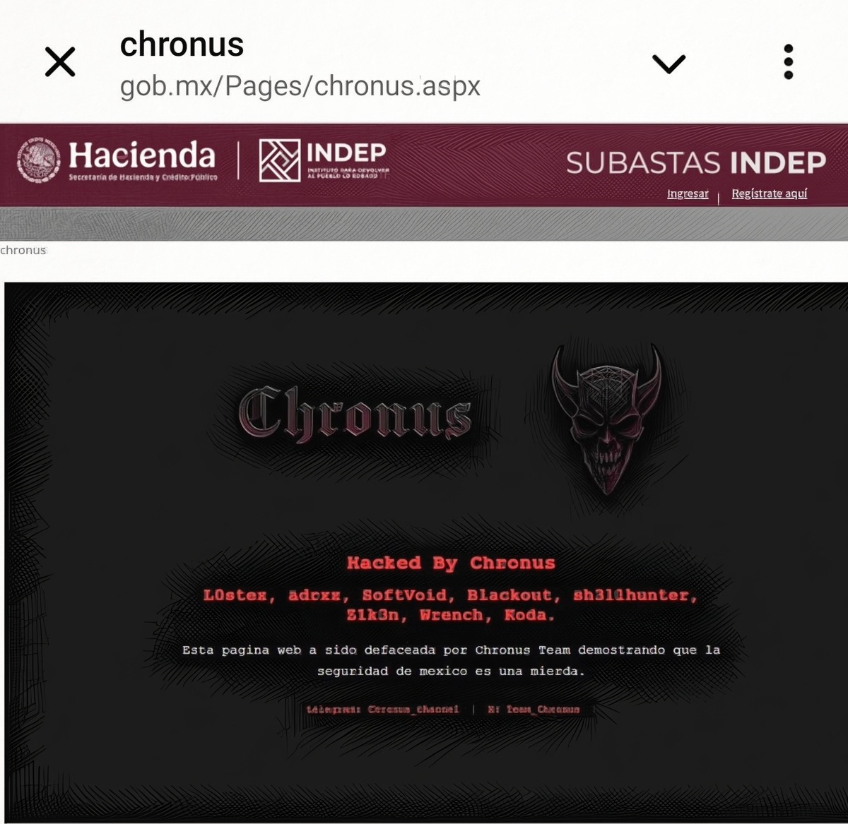 CDMX.- El grupo de hackers conocido como Chronus irrumpió una vez más en sistemas gubernamentales mexicanos, esta vez defaceando la página de subastas en línea del Instituto para Devolver al Pueblo lo Robado (INDEP). En la intervención, visible en el subdominio subastasenlinea.indep.gob.mx, los atacantes dejaron un mensaje provocador: “Esta página web ha sido defaceada por Chronus Team demostrando que la seguridad de México es una mierda”, acompañado de una lista de alias como L0stex, adrx, SoftVoid y otros. El incidente, reportado por el periodista Ignacio Gómez Villaseñor en X, ocurrió el 17 de enero de 2026 y fue archivado en web.archive.org para preservar la evidencia, destacando la rapidez con la que estos grupos exponen fallos básicos en la infraestructura digital federal.