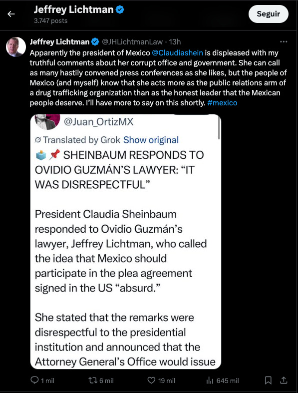 En una conferencia de prensa posterior a la audiencia, Lichtman hizo referencia a los comentarios de la presidenta Sheinbaum, quien había cuestionado que el gobierno estadounidense negociara con Guzmán, alias “El Ratón”, argumentando que es considerado un terrorista y que Estados Unidos no negocia con terroristas. El abogado respondió: “Lo que le diría a la presidenta Sheinbaum es que tal vez debería fijarse en sus predecesores en la Presidencia y tratar de averiguar por qué sucedió eso”.