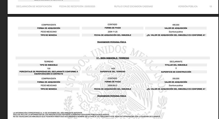Rutilio Escandón, exgobernador de Chiapas y reciente cónsul en Miami, reportó ingresos de 1.5 millones de pesos anuales y 17 propiedades, incluyendo un rancho de 320,000 m²