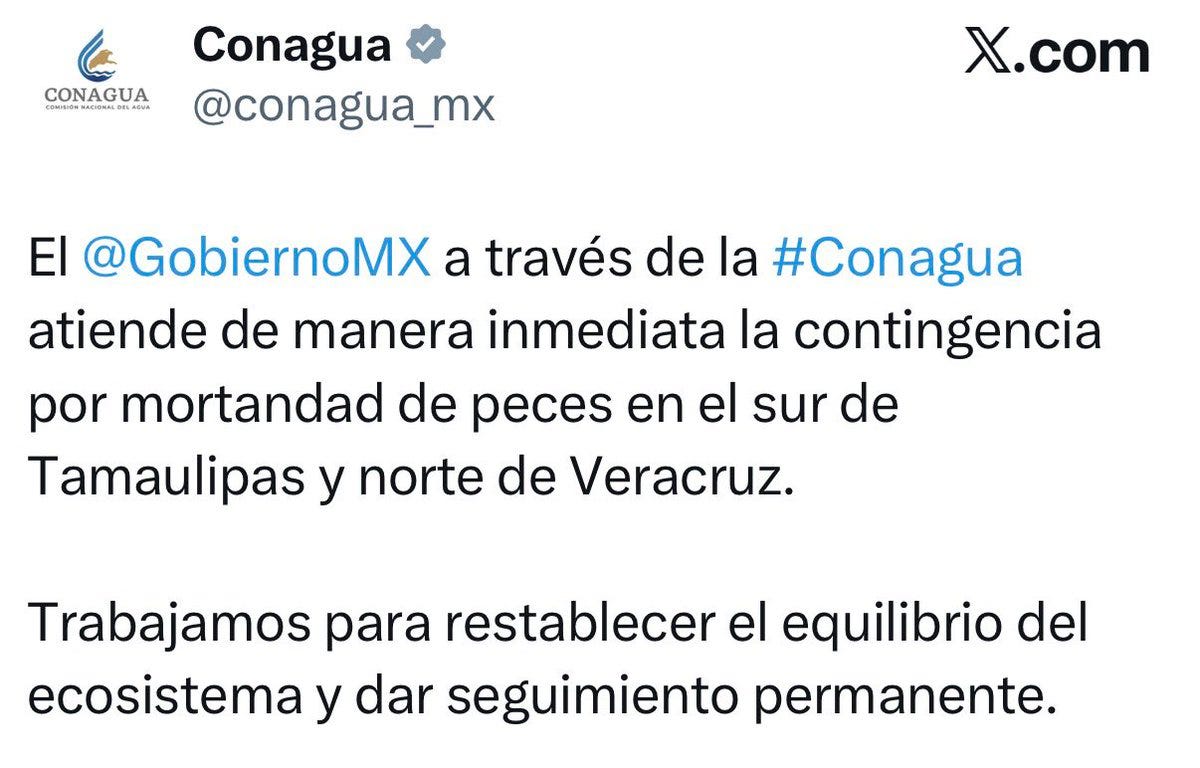 CDMX.- La Comisión Nacional del Agua salió al quite este domingo para “aclarar” la mortandad masiva de peces en el sur de Tamaulipas y norte de Veracruz: todo fue por la apertura de una compuerta en el estero El Camalote que mezcló agua dulce con salada y mató a miles de ejemplares en la Laguna de La Costa. Según ellos, ya cerraron la válvula, no hay hidrocarburos y ahora “monitorean y limpian”. Punto. Fin del comunicado.
