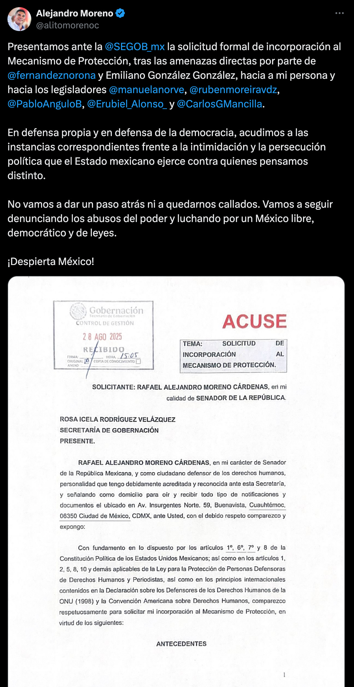 Analíticamente, la movida de Alito parece una jugada defensiva para equilibrar la balanza legal y mediática, victimizándose en un ecosistema donde el PRI ha perdido terreno electoral y enfrenta acusaciones de corrupción interna. Fuentes como La Jornada y Milenio confirman que Moreno también solicitó incorporación al Mecanismo de Protección de la Segob, citando riesgos a su integridad, pero ¿es esto genuino o una táctica para diluir su rol como agresor inicial? En un país polarizado, estas denuncias cruzadas solo avivan el fuego, recordándonos que la política mexicana a veces se resuelve más en tribunales que en debates. Mientras, el Senado se prepara para una sesión extraordinaria este viernes, donde el tema podría explotar de nuevo.