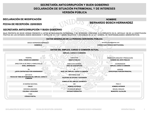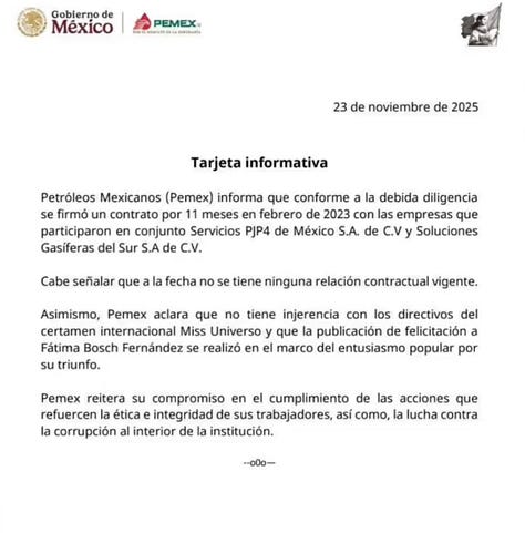 El contrato se firmó en febrero de 2023, en esa fecha, el padre de Miss Universo 2025, Bernardo Bosch, era coordinador ejecutivo en Pemex Exploración y Producción