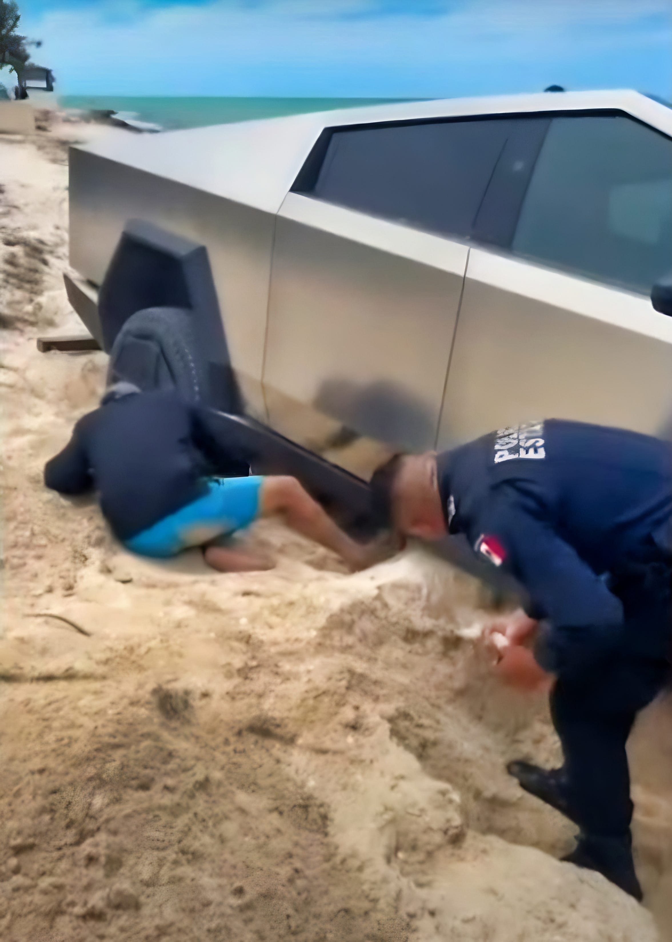 Según reportes de testigos y videos compartidos en plataformas, el conductor del Cybertruck decidió circular por la arena de la playa “Esmeralda” de San Benito, a pocos metros de la orilla del mar. A pesar de su diseño angular y su promesa de ser un todoterreno revolucionario, el vehículo eléctrico se hundió rápidamente en la arena blanda, incapaz de avanzar. La escena, captada en clips que circularon ampliamente, muestra a varias personas, incluyendo un elemento de la Secretaría de Seguridad Pública (SSP) de Yucatán armado con una pala, colaborando para liberar el auto. Tras varias horas de empujones y excavaciones, el Cybertruck fue finalmente rescatado, pero no sin dejar una marca en la opinión pública.