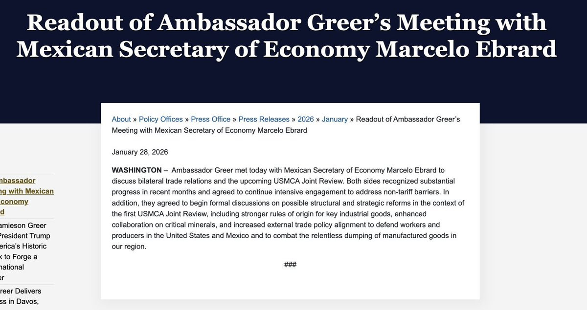 EU.- Marcelo Ebrard, secretario de Economía, calificó como “muy buena” su reunión este miércoles en Washington con Jamieson Greer, representante comercial de Estados Unidos. En un encuentro que duró más de una hora, abordaron el futuro del T-MEC, aranceles, la sección 232, industria automotriz, minerales críticos y seguridad en cadenas de suministro. Según fuentes oficiales como la Secretaría de Economía y la USTR, acordaron intensificar la colaboración contra barreras no arancelarias, endurecer reglas de origen y combatir el dumping para proteger a trabajadores y productores de ambos países, todo en preparación para la revisión obligatoria del tratado en julio de 2026.