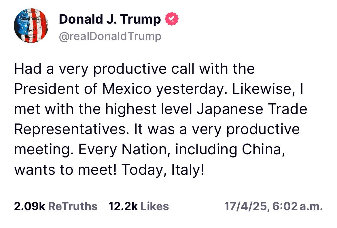 El post de Trump incluye una imagen que no se detalla en el mensaje, pero su texto señala: “Tuve una llamada muy productiva con la presidenta de México ayer".