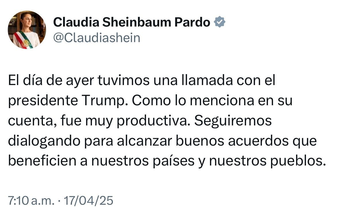 CDMX.— Los presidentes de Estados Unidos, Donald Trump, y de México, Claudia Sheinbaum, sostuvieron una llamada telefónica el pasado 16 de abril, la cual ambos mandatarios calificaron como “muy productiva”. Esta conversación marca la tercera llamada conocida entre ambos líderes desde que Trump asumió su segundo mandato, siguiendo intercambios previos el 6 de marzo de 2025 y otro en diciembre de 2024, tras la felicitación de Sheinbaum por la victoria electoral de Trump en noviembre de 2024. En un mensaje compartido en Truth Social a las 6:02 a.m. de este jueves, Trump destacó el diálogo con Sheinbaum como parte de una intensa agenda diplomática y comercial de su administración, que también incluyó reuniones con representantes comerciales de Japón y planes para próximos encuentros con Italia y China. Por su parte, Sheinbaum confirmó la llamada a través de su cuenta oficial en X, subrayando que ambas partes se enfocaron en alcanzar “buenos acuerdos” para beneficiar a sus respectivos países y pueblos.