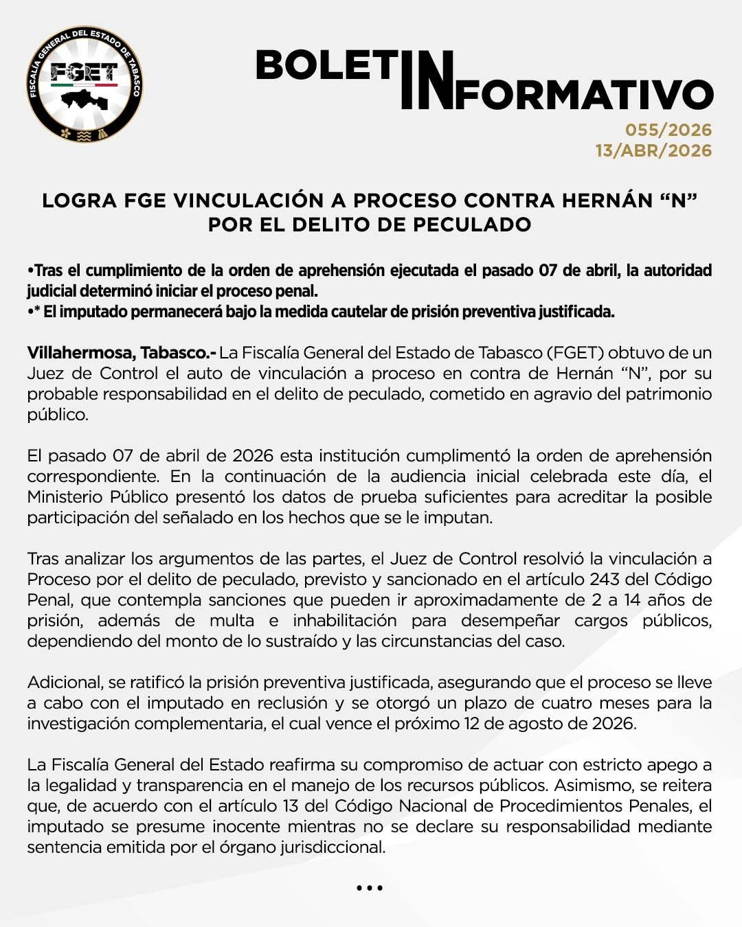 Tabasco.- La Fiscalía General del Estado de Tabasco logró este lunes la vinculación a proceso de Hernán Bermúdez Requena, exsecretario de Seguridad y Protección Ciudadana durante el gobierno de Adán Augusto López Hernández, por el delito de peculado. Un juez de control dictó prisión preventiva justificada mientras se investiga el presunto desvío de recursos públicos; enfrenta hasta 14 años de cárcel y cuatro meses de investigación complementaria. No es la primera vez: apenas hace diez días ya había sido vinculado por desaparición forzada.