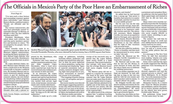 El New York Times expone escándalos de lujo entre líderes de Morena, mientras Sheinbaum defiende un discurso de austeridad