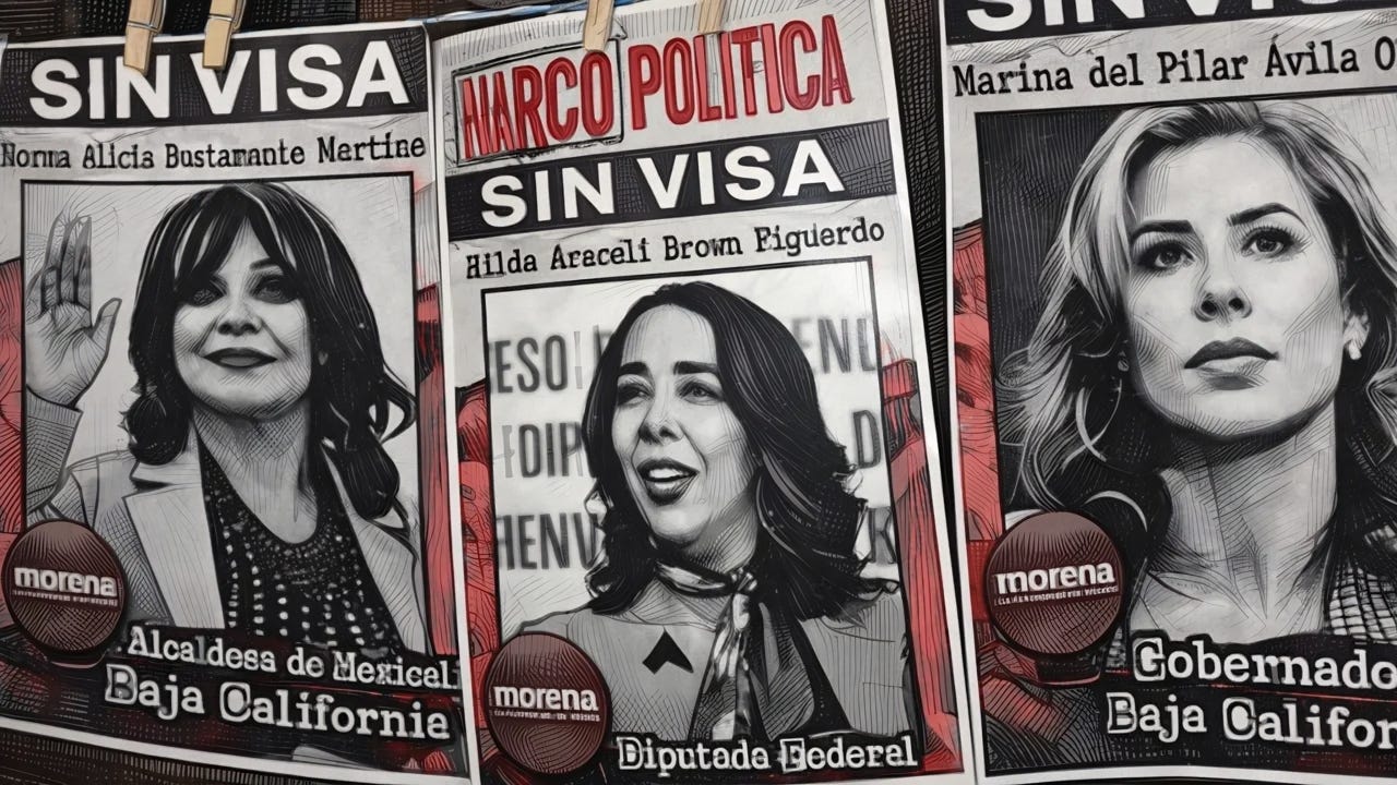 Baja California.- En un acto de denuncia pública que roza lo teatral pero golpea donde duele, activistas colgaron carteles en el muro fronterizo de Mexicali con fotos y nombres de funcionarios de Baja California a quienes Estados Unidos les revocó la visa, presuntamente por vínculos con el narco o corrupción. Este “tendedero” no es un chisme de barrio: se enmarca en una oleada de cancelaciones que, según reportes, afecta a al menos 50 políticos mexicanos, la mayoría de Morena, como parte de una operación antidroga impulsada por el gobierno de Trump desde 2025. La gobernadora Marina del Pilar Ávila Olmeda, la alcaldesa de Mexicali Norma Bustamante y el alcalde de San Felipe José Luis Dagnino figuran entre los señalados, confirmando un patrón de impunidad que el gobierno federal minimiza como “cacería política”.