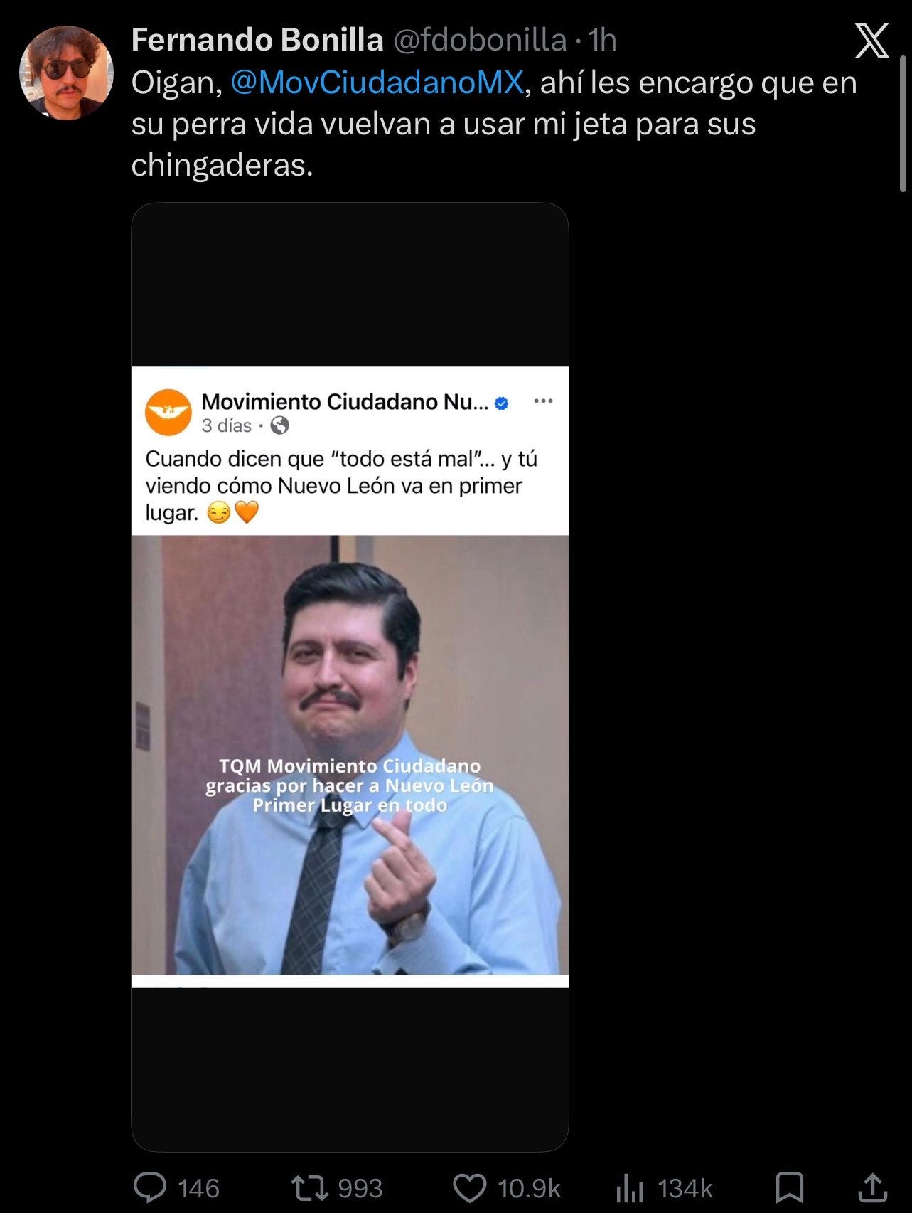 CDMX.- Fernando Bonilla, conocido por interpretar a Jerónimo Ponce III en la versión mexicana de La Oficina de Prime Video, estalló este martes contra Movimiento Ciudadano. En un tuit directo y sin filtros, el actor exigió al partido: “Oigan, @MovCiudadanoMX, ahí les encargo que en su perra vida vuelvan a usar mi jeta para sus chingaderas”. La razón: un meme publicado por la cuenta de MC en Nuevo León que tomaba la imagen del personaje para presumir que “Nuevo León va en primer lugar”, con guiño y corazón naranja incluido.