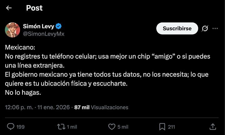 Este no es un caso aislado. El registro obligatorio, que entró en vigor el 1 de enero de 2026 para combatir extorsiones y delitos, ya genera alertas por su vulnerabilidad. Simón Levy, exfuncionario y experto en tecnología (@SimonLevyMx), advierte en un post con casi 100 mil interacciones: “No registres tu teléfono; el gobierno quiere tu ubicación y escucharte”. Recomienda chips “amigos” o líneas extranjeras, ya que el Estado ya tiene acceso a datos fiscales y personales vía INE o SAT. Críticos en respuestas coinciden: con el INAI disuelto, ¿quién protege la información?