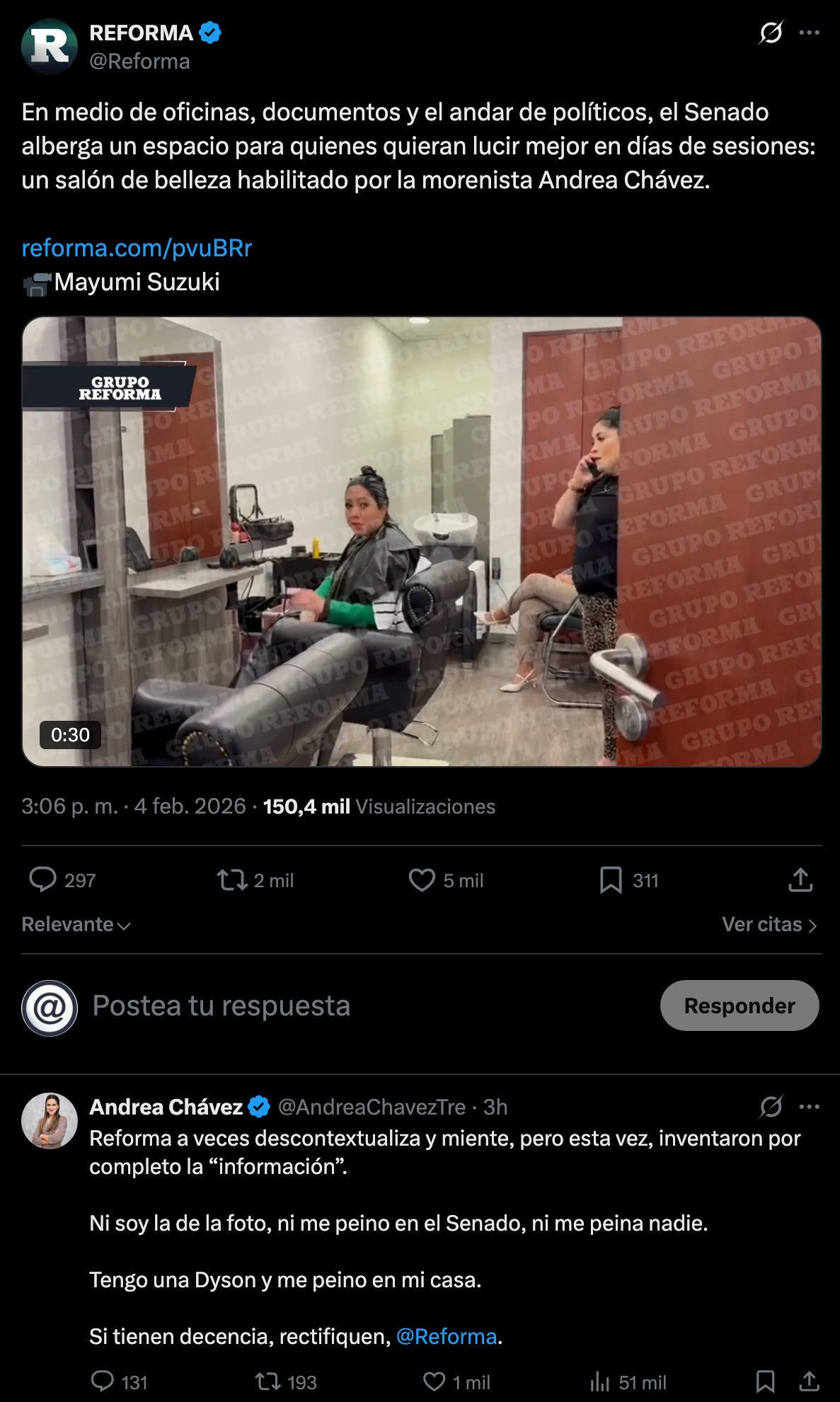 Este no es un capricho nuevo. Instalado en 2007 en Xicoténcatl y trasladado en 2011 a la sede actual, el salón fue suspendido en 2018 por Ricardo Monreal (Morena) en nombre de la “austeridad republicana”. Pero revivió bajo la batuta de Adán Augusto López, exsecretario de Gobernación y actual senador, aunque medios lo ligan a Andrea Chávez (Morena), quien lo niega rotundamente: “Ni soy la de la foto, ni me peino ahí; tengo una Dyson en casa”. Chávez exige rectificación, pero el daño está hecho.