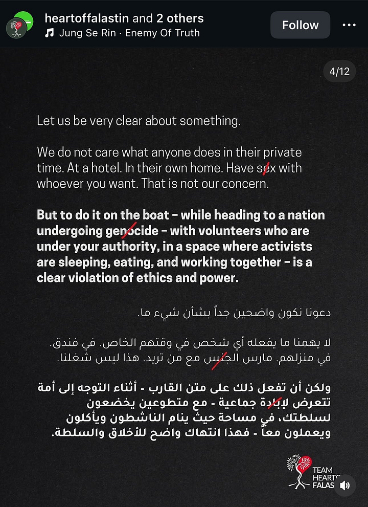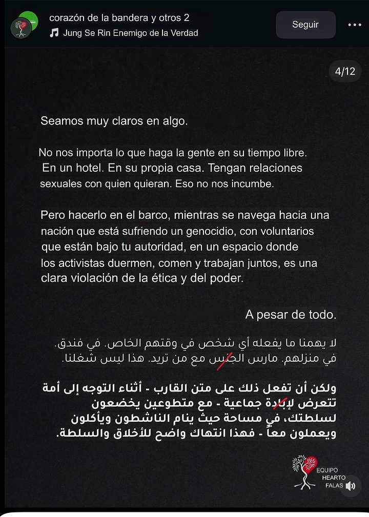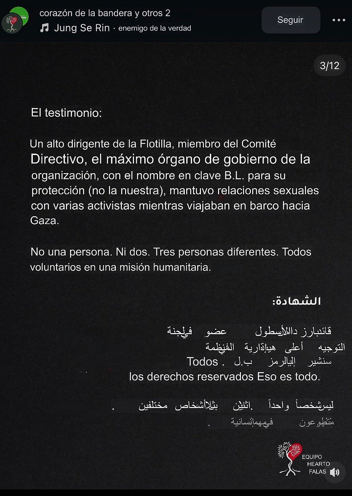 Gaza.- La nueva Global Sumud Flotilla, que zarpó el 12 de abril de 2026 con más de 70 embarcaciones y miles de participantes de 100 países para “romper el bloqueo” israelí, ya tiene su primer escándalo interno. La asociación Heart of Falastin denunció que un miembro senior del comité de dirección —identificado solo como B.L. por “seguridad”— dedica su tiempo en altamar a mantener relaciones sexuales con al menos tres de las activistas bajo su mando, lo que califica como “violación clara de ética y abuso de poder”. Las imágenes y testimonios que circulan en redes confirman que la “flotilla humanitaria” se convirtió, para algunos, en un crucero de placer.